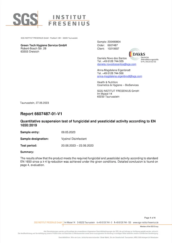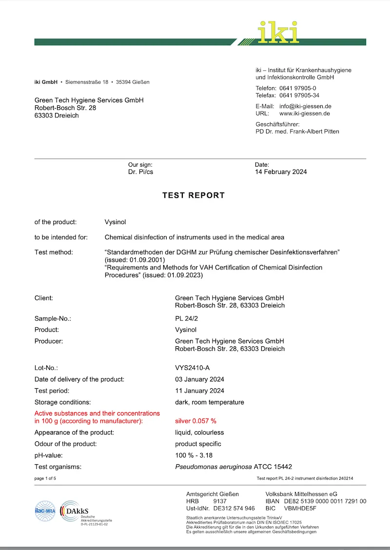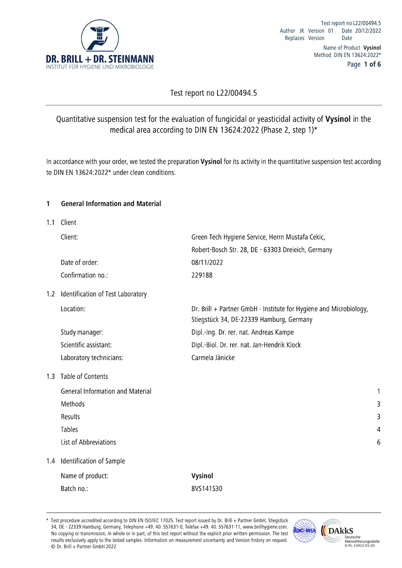 Die bakterizide, viruzide und fungizide Wirksamkeit der Vysinol-Desinfektionsmittel wurde durch Tests in den folgenden DDask-akkreditierten Laboratorien bestätigt: